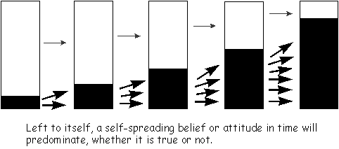 There are lots of examples of beliefs and behaviours which self-spread. With science, it is often sufficient for a belief to be unfalsifiable. Amongst religions, beliefs can actively propagate too. Simplistically, if your belief justifies killing or torturing everyone who disagrees with you, you may find that everyone (left alive) starts agreeing, and the belief will have spread! If some people think the only priority is converting other people to their beliefs, and success is proportional to effort, their beliefs will have an ever-increasing share of the vote (whether they are right or wrong). Belief systems that include as an element that "questioning belief is an evil thing to do" will prosper similarly.