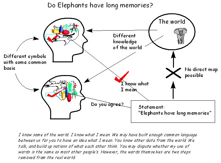 In the real world you can zoom in or out as often as you like... out to a satellite picture of the world, in to microbes or even molecules. So how much data is there in the real world, where each little cube contains so much more than just a colour? When you think about it, you realise that capturing the "real world" by picture or video or measurement is impossible. There is so much data in it that any actual hard disk, complete with data, is just a tiny part of it. From a mathematical perspective even one single exact number (say, a length), just like an infinite resolution picture of only one dimension, could not be put onto any hard disk. This all sounds obvious until you think about what languages try to do. They try to capture elements of this huge data set into a few bytes of information. In the confines of formal logic, truth is simply about comparing sentences, but when you try to include the real world into the equation, you have to be more careful.